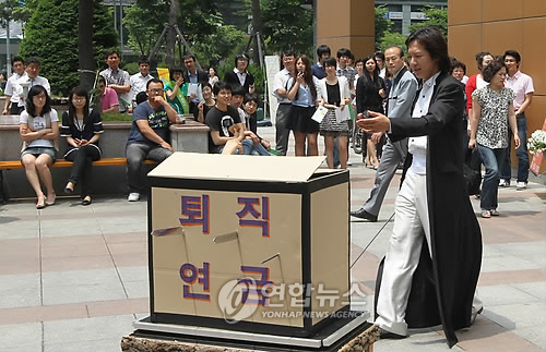 ↑ 고령사회에 대비한 퇴직연금의 효용성을 직장인들에게 알리기 위해 마술퍼포먼스.(연합뉴스 자료사진)