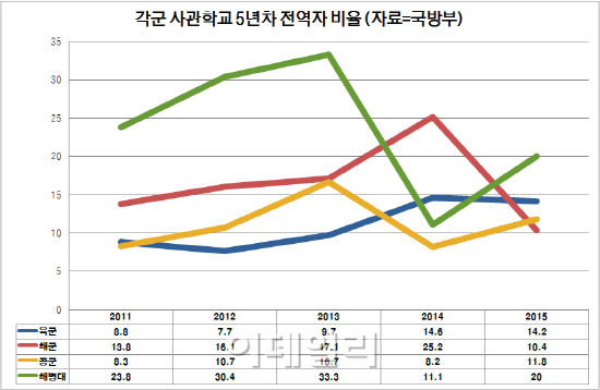 ◇육사 출신 전역 급증… 해·공군도 10%대22일 국방부가 김광진 새정치민주연합 의원실에 제출한 ‘2011~2015년 사관학교 출신 조기 전역자 처리 결과’ 자료에 따르면 지난 2010년 3월 임관해 5년간 복무한 각 군 사관학교 출신 장교는 468명이다. 이 중 12.8%인 60명이 올해 초 조기 전역을 신청한 것으로 나타났다. 각 군 사관학교 출신 장교들은 임관 후 10년 동안 의무 복무를 해야 하지만 5년을 채우면 전역 기회가 주어진다. 사관학교 출신 장교 양성에는 임관 전까지 1인당 평균 2억 3000만원이 소요된다.