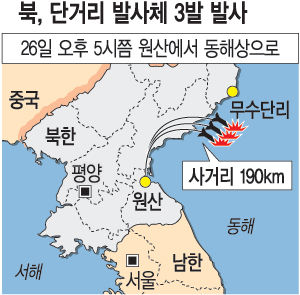 합동참모본부는 "북한이 오후 5시쯤 원산 북쪽에서 동해상 동북 방향으로 단거리 발사체 3발을 발사했다"며 "함경북도 김책과 화대 앞바다에 떨어졌다"고 밝혔다. 사거리가 190㎞ 정도여서 `KN-09`로 불리는 300㎜ 신형 방사포로 추정된다. 북한의 단거리 발사체 발사는 올 들어 10번째다. 합참 관계자는 "신형 방사포 성능 개량을 위해 단거리 발사체를 부쩍 자주 발사하는 것으로 보인다"며 "사거리도 지난번보다 40㎞가량 더 늘어났다"고 말했다.