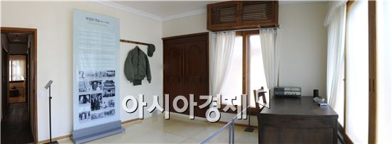 ↑ 박정희 전 대통령 생가 서재. 박 전 대통령이 5.16 쿠데타 당시 입었던 것과 같은 디자인의 군복 점퍼와 모자가 눈에 띈다. 사진제공-서울시.
