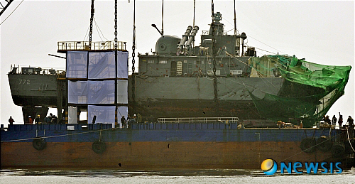 지난 2010년 4월 침몰현장에서 인양된 천안함 함미가 그물에 쌓인채 바지선에 올려져 있다.(사진=뉴시스)