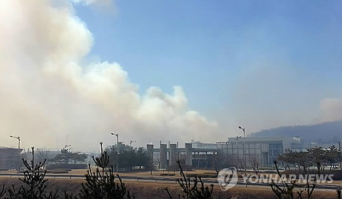 ↑ 도라전망대 인근 DMZ 화재 (파주=연합뉴스) 23일 오후 경기도 파주시 장단면 도라전망대 인근 비무장지대(DMZ)에서 불이 나 연기가 피어오르고 있다. 2015.3.23 <<독자제공>> suki@yna.co.kr