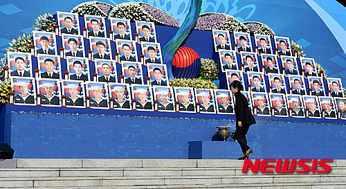 【대전=뉴시스】박주성 기자 = 박근혜 대통령이 26일 오전 국립 대전현충원에서 열린 천안함 용사 5주기 추모식에서 추모사를 하기 위해 천안함 46용사의 영정을