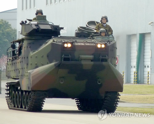 ↑ 일본 방위성은 지난 4월 16일 센카쿠(尖閣.중국명 댜오위다오<釣魚島>)열도 방어를 위해 추진 중인 수륙양용차 도입 사업과 관련, 차종 선정에 참고하기 위해 구입한 미군 수륙양용차 AAV7(사진)을 이바라키(茨城)현 육상자위대 기지에서 공개했다. (교도=연합뉴스 자료사진)