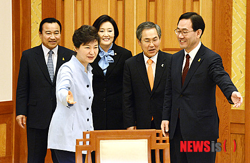 【서울=뉴시스】홍찬선 기자 = 박근혜 대통령이 10일 오전 청와대에서 이완구 새누리당 원내대표, 주호영 정책위의장, 새정치민주연합 박영선 원내대표, 우윤근 정책위의장과 취임 첫 여야 원내지도부 회동을 하기 위해 자리를 안내하고 있다.