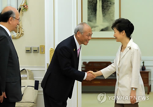 ↑ 박 대통령, 도쿄도지사 접견 (서울=연합뉴스) 이정훈 기자 = 박근혜 대통령이 25일 오전 청와대를 예방한 마스조에 요이치 도쿄도지사와 악수하고 있다. 사진 왼쪽은 벳쇼 주한대사.
