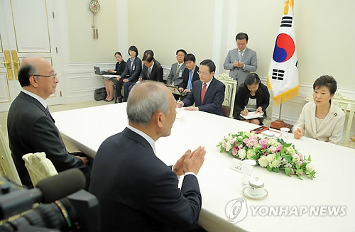 ↑ 도쿄도지사 접견하는 박 대통령 (서울=연합뉴스) 이정훈 기자 = 박근혜 대통령이 25일 오전 청와대에서 마스조에 요이치 도쿄도지사와 접견하고 있다.
