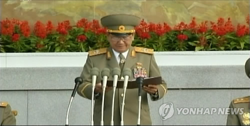 ↑ 북한군 총정치국장 "자주권 위협하면 美 본토 핵공격" (서울=연합뉴스) 북한군 `서열 1위`인 황병서 군 총정치국장이 정전협정 체결 61주년인 27일 평양 금수산태양궁전 앞에서 열린 결의대회에서 연설하고 있다.