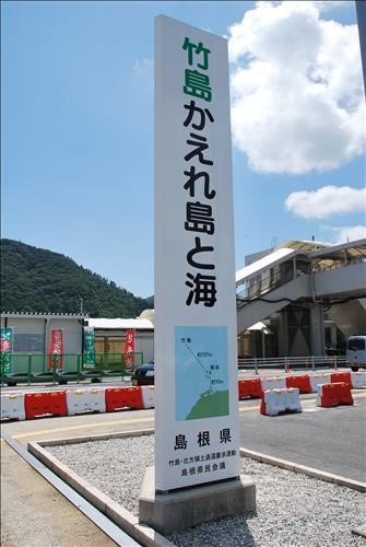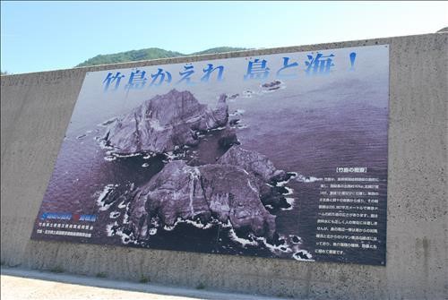 | 일본 오키섬 사이고항 주차광장에 만들어진 `다케시마와 바다를 돌려달라`는 내용의 입간판. |