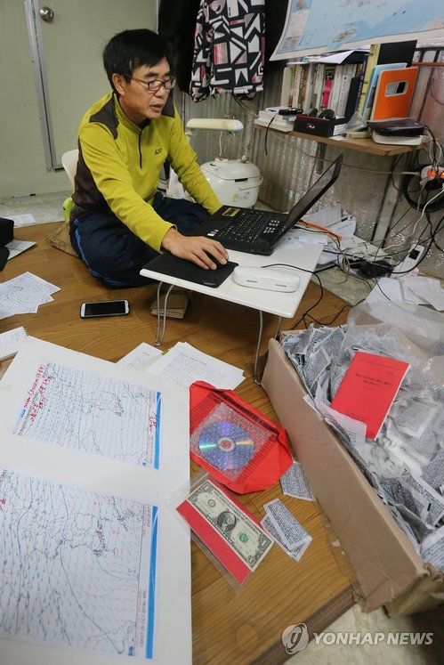↑ 지도·삐라·도표로 가득한 집 (포천=연합뉴스) 임병식 기자 = 민간 대북전단 살포 `일인자`로 통하는 대북풍선단장 이민복(57)씨가 연합뉴스와의 인터뷰에서 자택을 공개했다. 지도와 삐라, 도표로 가득한 모습이 눈길을 끈다. 2014.10.30 andphotodo@yna.co.kr