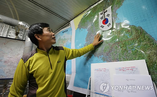 ↑ 대북전단 살포 `일인자` 이민복 씨 자신의 `풍선 작전지도`를 가리키며 전단살포를 설명하고 있다. 지도의 북한 지역에 걸어놓은 십자가와 태극기가 눈길을 끈다. <<연합뉴스DB>>