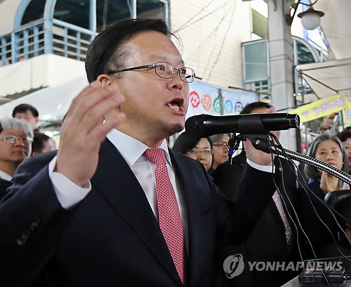 ↑ (대구=연합뉴스) 이재혁 기자 = 김부겸 전 민주당 최고위원이 24일 대구 서문시장에서 대구시장 선거 출마를 선언하는 기자회견을 하고 있다. 2014.3.24 yij@yna.co.kr