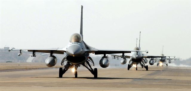 KF-16 전투기들이 이륙을 위해 활주로로 진입하고 있다. 한국일보 자료사진