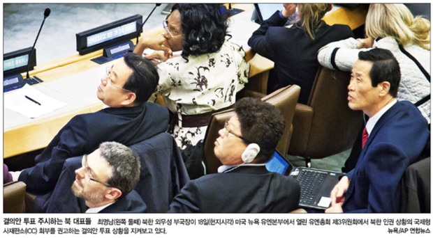 중앙일보, 한겨레, 한국일보 등은 미국 뉴욕 유엔본부에서 열린 유엔총회 제3위원회에서 최명남 북한 외무성 부국장 등 북한 대표들이 결의안 투표 상황을 주시하고 있는 모습을 1면에 담았다.