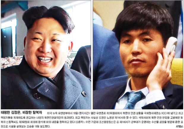 서울신문은 1면 사진 ‘희비 갈린 北당국자와 탈북자’에서 최명남 부국장과 탈북 인권운동가 신동혁씨의 상반된 표정에 주목했다. 국민일보도 ‘태평한 김정은, 비장한 탈북자’라는 제목의 사진을 통해 “북한의 인권 상황을 국제형사재판소에 넘기고 최고책임자들을 제재하도록 권고하는 내용의 북한인권결의안이 통과됐다”며 “최고 책임자는 사실상 김정은 노동당 제1비서라 할 수 있다. 국제사회에 북한 인권 탄압을 고발해온 탈북자 신동혁씨도 제3위원회 회의에 참석해 회의 내용을 청취하고 있다”고 설명했다.