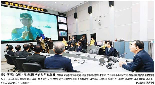 19일 국민안전처가 출범했다. 동아일보와 세계일보는 정홍원 국무총리가 세종로 정부서울청사 1층에 설치된 국민안전처 중앙재난안전상황실을 방문해 인천해양경비안전센터 박경규 경감과 영상통화를 하는 모습을 1면에 보도했다. 동아는 “정 총리는 국민안전처 및 인사혁신처 공동 출범식에서 ‘국무총리 소속으로 발족한 두 기관은 공공부문 국가 혁신의 양대 축’이라고 강조했다”고 전했다.
