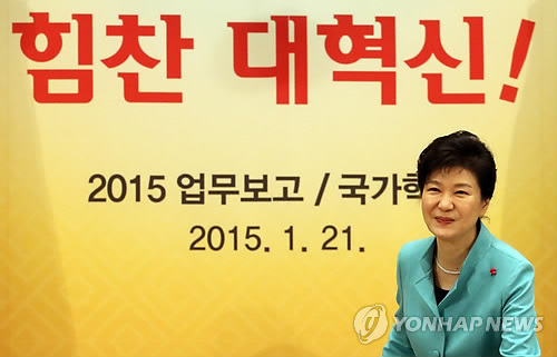 ↑ ‘국가혁신’업무보고장 들어서는 박 대통령 (서울=연합뉴스) 도광환 기자 = 박근혜 대통령이 21일 오전 청와대 영빈관에서 열린 `국가혁신`을 주제로 한 합동 신년 업무보고에서 회의장에 입장, 착석하려 하고 있다.