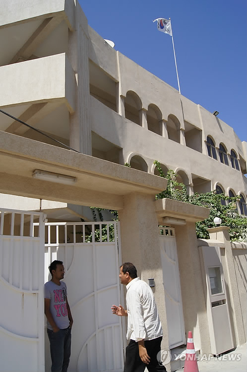 ↑ 트리폴리 韓대사관에 IS 공격…경비원 2명 사망 (서울=연합뉴스) 리비아 수도 트리폴리에 있는 한국 대사관이 12일(현지시간) 무장괴한의 공격을 받아 경비원 2명이 숨지고 1명이 부상했다고 신화통신이 보도했다. 통신은 보안 당국 관계자를 인용해 차를 타고 지나가던 무장 단체가 대사관 앞에서 다수의 총알을 발사했다고 전했다. 이 관계자는 "이번 사건은 이슬람 국가(IS)에 의해 자행된 것"이라고 전했다. 사진은 2011년 8월 28일 소총 무장 괴한 10여 명 난입 사건 당시의 리비아 주재 한국 대사관 모습. photo@yna.co.kr