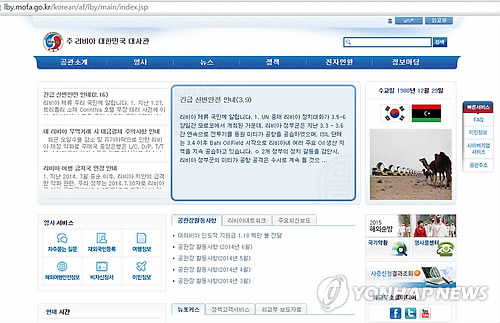 ↑ 트리폴리 韓대사관에 괴한 공격해 2명 사망…"IS 소행" (서울=연합뉴스) 리비아 수도 트리폴리에 있는 한국 대사관이 12일(현지시간) 무장괴한의 공격을 받아 경비원 2명이 숨지고 1명이 부상했다고 신화통신이 보도했다. 통신은 보안 당국 관계자를 인용해 차를 타고 지나가던 무장 단체가 대사관 앞에서 다수의 총알을 발사했다고 전했다. 이 관계자는 "이번 사건은 이슬람 국가(IS)에 의해 자행된 것"이라고 전했다. 하지만 공격의 원인이나 동기 등 자세한 내용은 언급하지 않았다고 통신은 덧붙였다. 사진은 리비아 내 이슬람 국가(IS)의 테러 관련 신변 안전 안내를 하고 있는 주 리비아대사관 홈페이지. photo@yna.co.kr