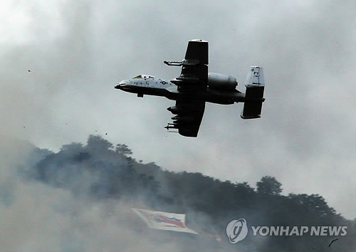 ↑ 통합화력전투 훈련 미 A-10기 (포천=연합뉴스) 김동진 기자 = 6ㆍ25전쟁 62주년을 맞아 우리 군과 미군이 역대 최대 규모의 연합 통합화력전투 훈련을 했다. 22일 경기도 포천 승진훈련장에서 김황식 국무총리 주관으로 우리 군의 확고한 군사대비태세와 전투의지를 확인하는 한미 연합 통합화력훈련이 실시됐다. 사진은 미 A-10기가적 전차를 30mm 기관총으로 사격하며 비행하는 모습. 2012.6.22 kimd@yna.co.kr
