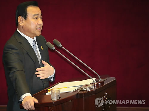 ↑ 국회 답변하는 이완구 (서울=연합뉴스) 진성철 기자 = 이완구 국무총리가 15일 국회 본회의에서 진행된 경제분야 대정부질문에서 성완종 전 경남기업회장으로부터의 금품수수 의혹에 대한 질의에 답변하고 있다.
