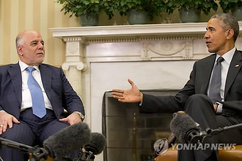 ↑ 이라크 총리, 백악관 방문 (AP=연합뉴스) 미국을 방문중인 하이다르 알-아바디 이라크 총리(왼쪽)가 14일(현지시간) 워싱턴DC의 백악관에서 버락 오바마 대통령과 대화하고 있다. bulls@yna.co.kr