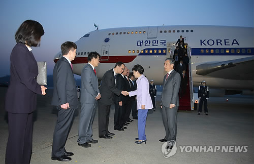 ↑ (성남=연합뉴스) 중남미 4개국 순방을 마친 박근혜 대통령이 `건강 악화`로 국내 현안에 대한 해법이 당분간 미뤄질 전망이다. 사진은 순방을 마친 박대통령이 27일 오전 성남 서울공항에 도착, 환영나온 인사들과 악수를 하고 있다.
