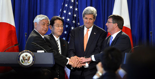 27일 미국과 일본은 케리 국무장관·카터 국방장관과 기시다 후미오(岸田文雄) 외무상·나카타니 겐(中谷元) 방위상이 참석한 가운데 뉴욕의 월도프 아스토리아 호텔에서 외교·국방장관 연석회의(2+2)를 열고 새로운 가이드라인을 확정했다.