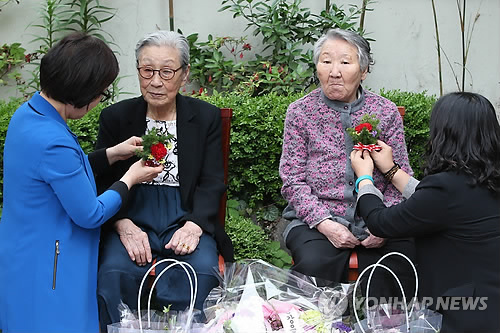 ↑ `꽃할머니께 달아 드리는 카네이션` (서울=연합뉴스) 김주성 기자 = 어버이날인 8일 위안부 피해 할머니들의 쉼터인 서울 마포구 연남동 `평화의 우리집`에서 열린 위로 행사에서 윤미향 한국정신대문제대책협의회 상임대표(맨 오른쪽)와 이미경 새정치민주연합 의원(맨 왼쪽)이 김복동 할머니(왼쪽에서 두번째)와 길원옥 할머니에게 카네이션을 달아주고 있다.