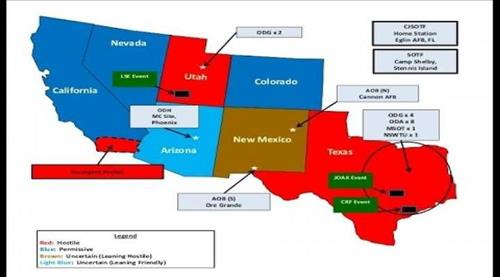 이들 가운데 텍사스와 유타 주는 `적색`으로, 뉴멕시코를 제외한 나머지 주들은 `청색`으로 표시된 훈련지도가 공개된 게 발단이 됐다.
