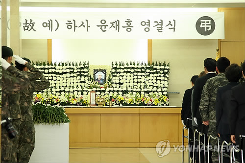 ↑ "영원히 기억할게"…예비군 사망자 영결식 (성남=연합뉴스) 이우성 기자 = 서울 내곡동 예비군훈련장에서 발생한 총기난사 사건으로 숨진 윤재홍(24) 예비역 하사의 영결식이 18일 오전 성남 국군수도병원 영결식장에서 육군 제52사단장으로 엄수됐다. gaonnuri@yna.co.kr