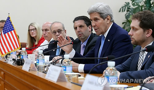 ↑ 케리 美 국무부 장관 모두발언 (서울=연합뉴스) 전수영 기자 = 존 케리 미국 국무부 장관이 18일 오전 서울 외교부 청사에서 열린 윤병세 외교부 장관과의 한·미 외교장관 회담에서 모두발언을 하고 있다.