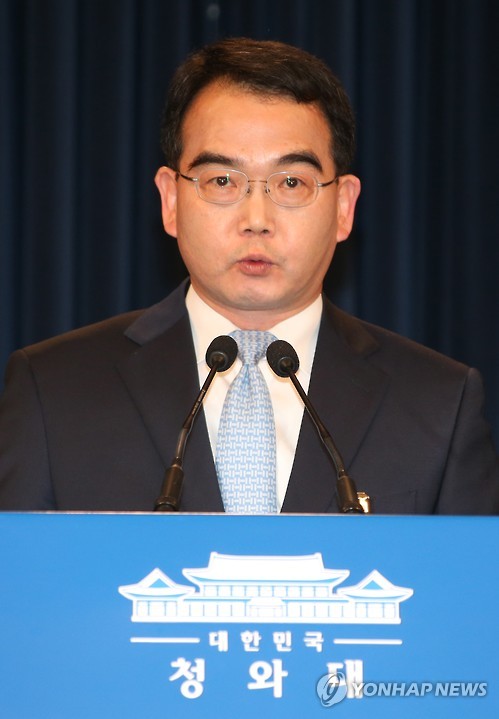 ↑ 새 총리에 황교안 법무장관 내정…50대 총리 발탁 (서울=연합뉴스) 백승렬 기자 = 김성우 홍보수석이 21일 청와대 춘추관에서 박근혜 대통령이 새 국무총리 후보자에 황교안 법무부 장관(58)을 지명했다고 발표하고 있다.