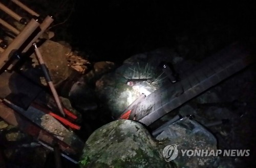 (화천=연합뉴스) 이재현 기자 = 28일 오전 1시 30분께 강원 화천군 사내면 용담리 인근 생태탐방로 둘레길에서 육군 모 부대 소속 장병 21명이 야간 전술 훈련 중에 나무다리가 끊어지면서 3m 아래로 추락했다.