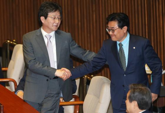 ↑ 새누리당 유승민 원내대표와 새정치민주연합 전병헌 최고위원이 29일 새벽 서울 여의도 국회에서 열린 5월 임시국회 마지막 본회의에서 공무원연금법 개정안 등 60여 개 법안이 처리된 뒤 서로 격려하며 악수를 나누고 있다. /사진=뉴스1