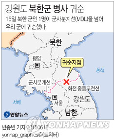 "10대 후반 하전사, 귀순 의사 확인"…북한군 특이징후 없어 연합뉴스 입력 2015.06.15. 11:06 수정 2015.06.15. 11:40(서울=연합뉴스) 김귀근 이영재 기자 = 북한군 병사(하전사) 1명이 15일 비무장지대(DMZ)내 소초(GP)를 통해 우리 군에 귀순했다.