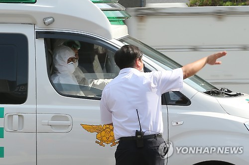 ↑ 지방에서 후송되는 메르스 확진환자 (서울=연합뉴스) 황광모 기자 = 18일 오후 서울 을지로 국립중앙의료원에 중동호흡기증후군(메르스) 환자가 119 구급대 구급차를 통해 이송되고 있다.