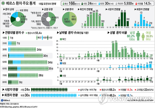 이날 현재 국내 메르스 환자는 모두 166명이며, 이 가운데 24명이 사망하고 30명이 퇴원했다. 112명의 치료 환자 중에는 16명이 상태가 불안정하다. 현재 격리 중인 사람 수는 모두 5천930명이다.