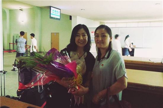 ↑ 평양을 방문한 신은미씨(왼쪽)이 공항에 마중나와 있다고 소개한 수양딸 설경과 사진을 찍고 있다.(사진=신은미씨 페이스북)