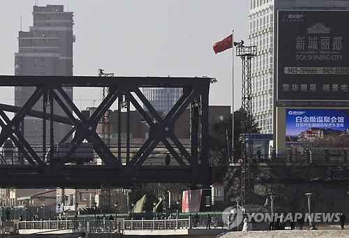 ↑ 중국 단둥을 출발한 트럭이 북한 신의주와 이어지는 압록강 철교 위를 지나가고 있다. (AP=연합뉴스 자료사진)
