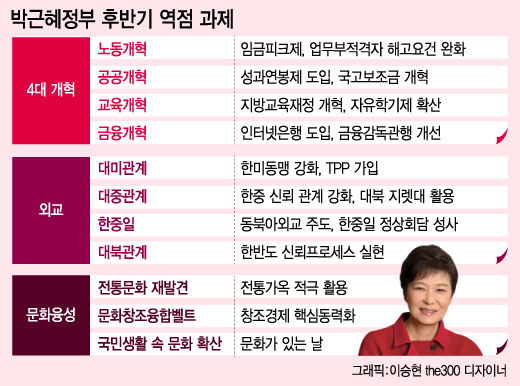 박 대통령의 집권후반기 최대 역점과제는 단연 `4대 개혁`이다. 노동시장을 비롯해 공공, 교육, 금융 등 4대 분야에서 역대 정권들이 이루지 못했던 개혁을 반드시 완수해 낸다는 목표다.