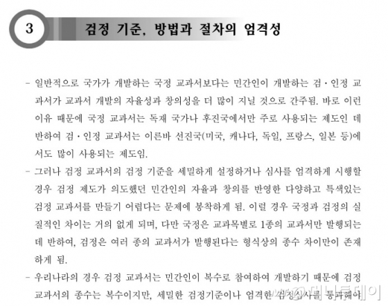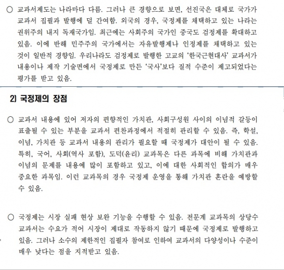 비슷한 시각은 새누리당이 지난 2013년 11월 발간한 정책리포트 `한국사 교과서를 둘러싼 한국사 교과서를 둘러싼 논쟁과 해법`에서도 엿볼 수 있다. 이 정책리포트에서는 "국정제는 소수의 제한적인 집필자 참여로 인해 교과서의 다양성이나 수준이 매우 낮다"고 지적했다.