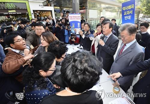 (서울=연합뉴스) 임형섭 김동현 기자 = 새정치민주연합 문재인 대표가 13일 거리로 나가 역사교과서 국정화 반대 서명운동을 벌였으나, 같은 장소에서 맞불집회를 연 보수단체 회원들이 욕설을 하며 거칠게 항의하는 등 소동이 빚어졌다.