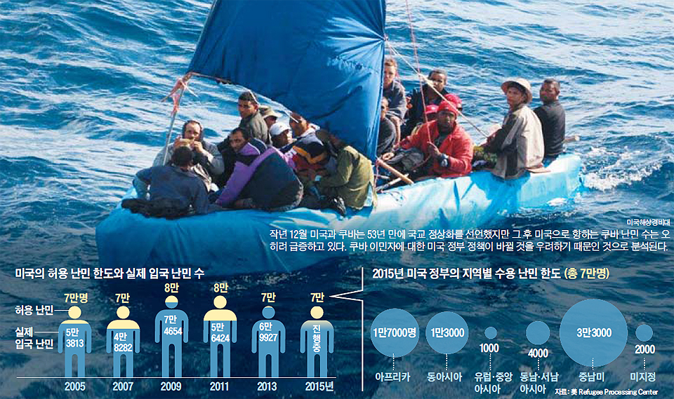 [지군촌 난민 6000만.. 커지는 분쟁 불씨] [4·끝] 美도 난민이 발등의 불美 난민쿼터 1년에 7만명뿐.. 중남미서 유입 증가로 고민美의 `마른 발 젖은 발` 정책 폐기될 것 우려한 쿠바인들, 플로리다 해협에 뛰어들어 유럽 골칫거리 시리아난민.. 미국에겐 사실 `강 건너 불`조선일보뉴욕/김덕한 특파원입력2015.10.26. 03:06수정2015.10.26. 08:53유럽과 중동 지역의 가장 큰 국제문제로 등장한 시리아 난민 사태와 관련, 미국은 난민 수용에 대해 유럽에 비하면 매우 소극적인 태도를 보이고 있다. 미국이 받아들인 시리아 난민은 2011년 시리아 내전 발발 이후 지금까지 1500여명에 불과하다. 미국은 2013년부터 난민 쿼터를 연간 7만명으로 못 박아 놓고 있다.